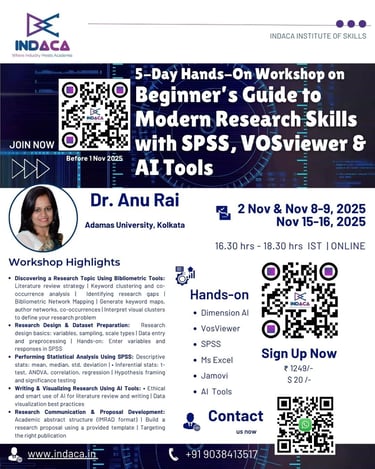This course helped me build a strong foundation in statistical methods using SPSS, and my first experience with VOSviewer was amazing!" β Puja Sarkar, Visva Bharati